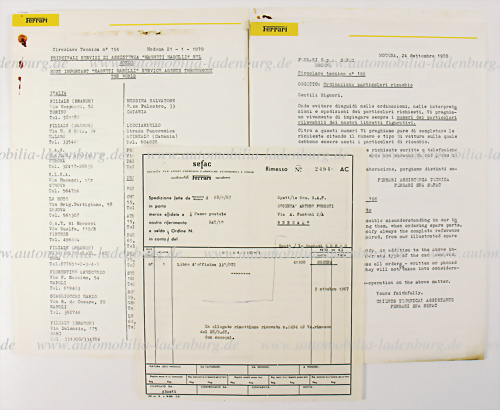 Konv. 10tlg. darunter Anschreiben Ferrari, datiert 14.08.1969, gestempelt handsigniert; 2x Importhändler International; Circolare Tecnica Nr. 154, datiert 21.01.1970; Circolare Tecnica Nr.166 datiert 24.09.1970, usw. leichte Gebrauchsspuren, ansonsten guter Zust.