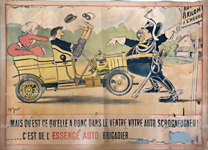 Frankreich um 1910, original Werbeplakat "Essence Auto Brigadier", Entwurf Georges Munier, 118x158cm, Plakat mit Fehlstellen, sowie Einrissen, sollte restauriert werden