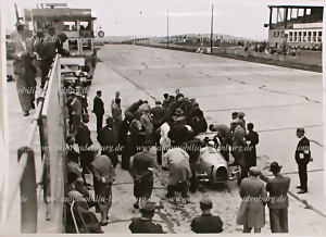 original s/w Aufnahme, im Vordergrund der Auto Union Typ A von Momberger vor dem Wagen von Prinz zu Leiningen, im Hintergrund ist der Bugatti T59 von Benoist zu sehen, Grand Prix Frankreich Montlhery 1934, 20x14cm