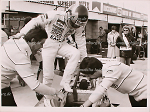 1977, original s/w Aufnahme von Carlos Reutemann in einem Ferrari 312T2. Der Hauptfokus des Fotos liegt jedoch auf einem Mechaniker, welcher die Reifen des Rennwagens überprüft. Rückseite gestempelt „Kurt Molzer“.21,5x 16,5 cm.