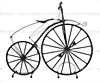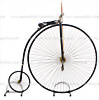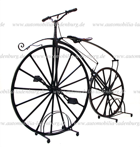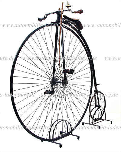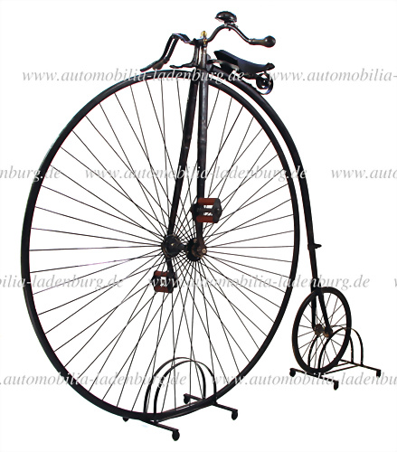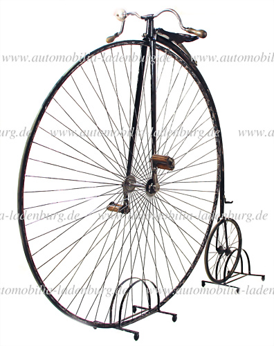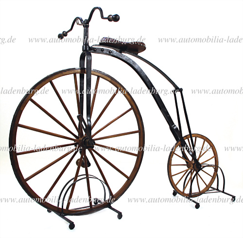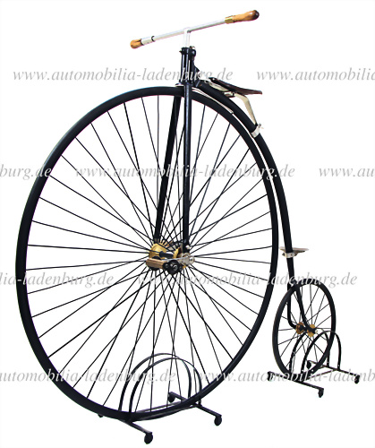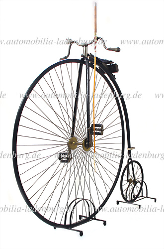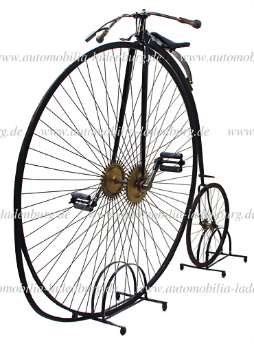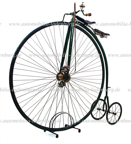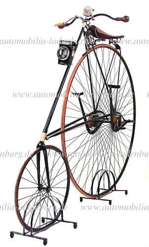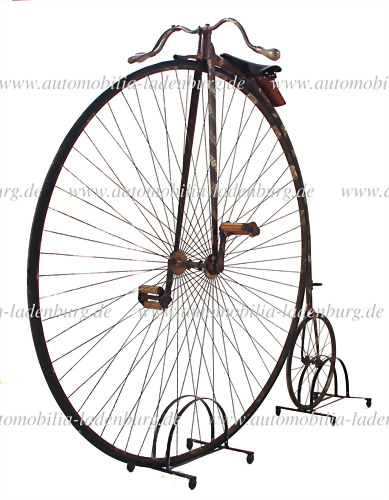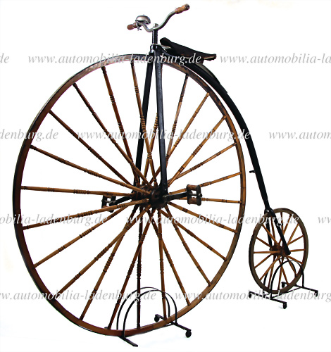 1888, großes Hochrad Marke Eigenbau mit vorderen und hinteren Holzspeichenrädern mit gedrechselten Speichen auf Eisenbereifung, Sattel auf Blattfedern, schmiedeeisernem Rahmen, Vorderrad 142 cm, Hinterrad 54 cm, Länge 200 cm, Lenkerhöhe 163 cm