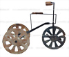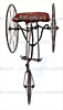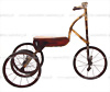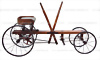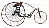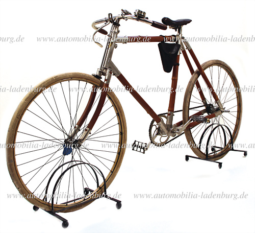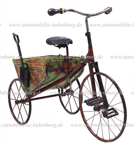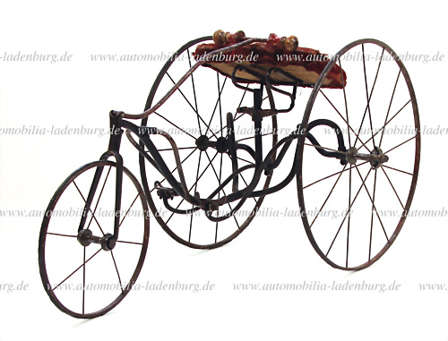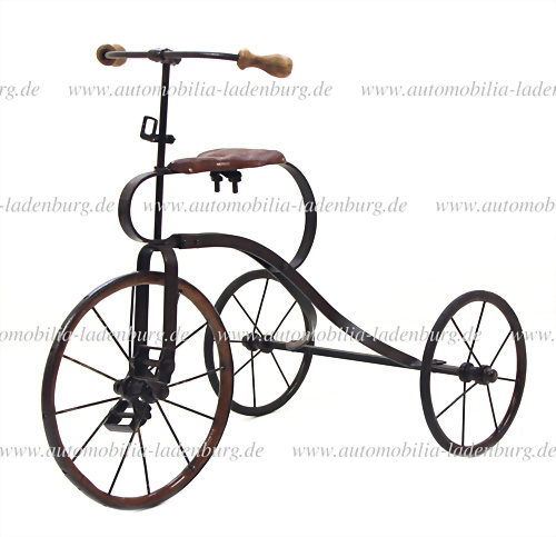 1890, Tretkurbelrad mit Gummireifen, Holzspeichen Vorderrad mit Gummireifen, schmiedeeiserner Rahmen, Bronzelager, Hinterrad und Sattel nicht original, rechte Bronzepedale von A. Bieuf-Rad, linke fehlend, Vorderrad 90 cm, Hinterrad 55 cm, Länge 145 cm, Lenkerhöhe 125 cm, sehr selten