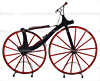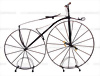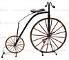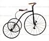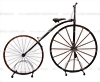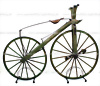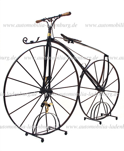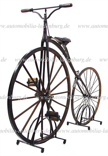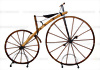 1889, Boneshaker mit schmiedeeisernem Rahmen, original Linierung, Holzspeichenrädern mit Eisenbereifung, Hinterrad nicht original, Sattel auf Blattfeder, Bremse auf das Hinterrad, Bronze-Gleitlager, Holzpedale, Vorderrad 85 cm, Hinterrad 70 cm, Länge 165 cm, Lenkerhöhe 120 cm