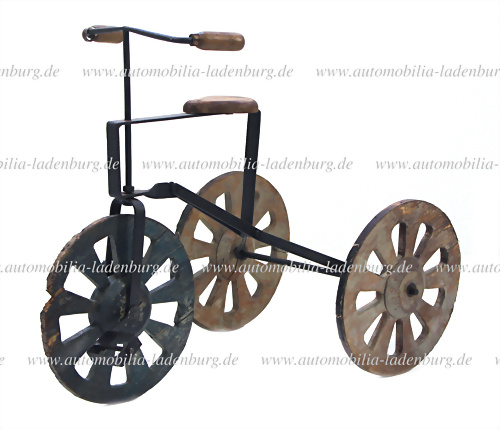 1920, Kinderdreirad mit Vorderradpedalantrieb, Holzrädern und schmiedeeisernem Rahmen, Lenkerhöhe 60 cm, Länge 80 cm