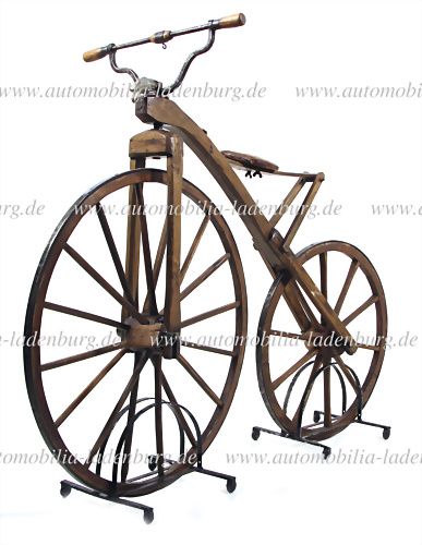 1899, Tretkurbel-Holzrad ausgestattet mit Beinauflage, Holzpedalen auf verstellbarer Tretkurbel, original Ledersattel auf Blattfedern, Hinterradbremse mit Seilzug, Vorderrad 90 cm, Hinterrad 80 cm, Länge 170 cm, Lenkerhöhe 130 cm