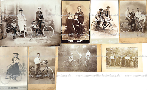 Um. 1900, Konvolut 8 original s/w Kabinettaufnahmen, u.a. Familienaufnahme mit Zwei-/Dreirädern, Tandem, etc., verschiedene Formate
