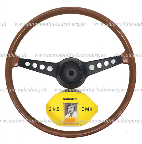 Abarth Lenkrad für 850 Coupe / Spyder, 124 Coupe, von Hans Herrmann, Durchmesser 38cm, dazu ONS Fahrerarmbinde „Industrie“ mit s/w Aufnahme datiert 31.12.1975