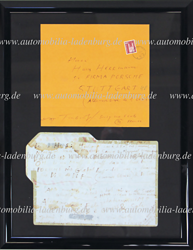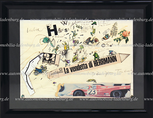 Kunstwerk "La Vendetta di Herrmann", persönliches Geschenk von Jean Tinguely (1925-1991) an Hans Herrmann, Tinguely war ein Freund von Hans Herrmann, Kunstwerk mit persönliche Widmung "Dein Jean Tinguely", gerahmt im Passepartout, 43,5x55cm