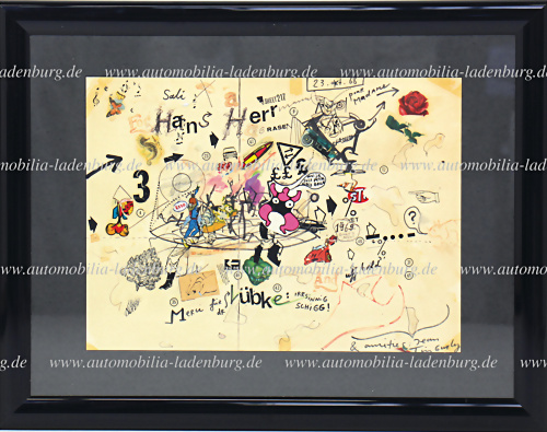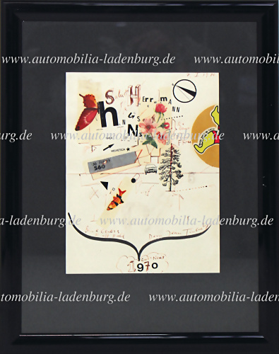 Kunstwerk "Salut Herrmann", datiert 07.01.1970, persönliches Geschenk von Jean Tinguely (1925-1991) an Hans Herrmann, Tinguely war ein Freund von Hans Herrmann, Kunstwerk gerahmt im Passepartout, 55x43,5cm