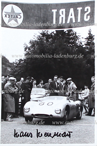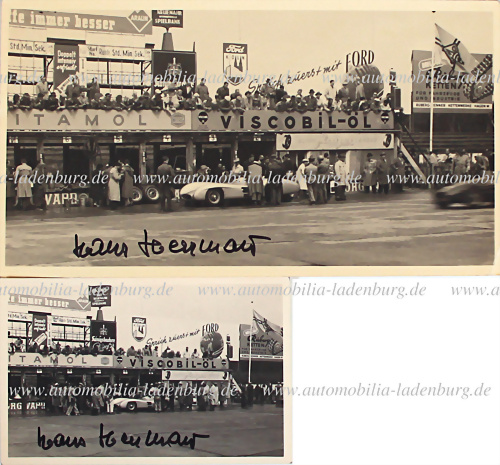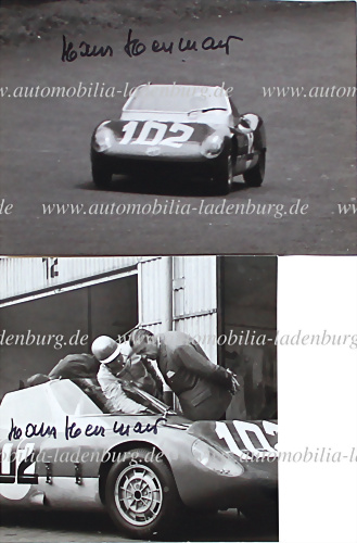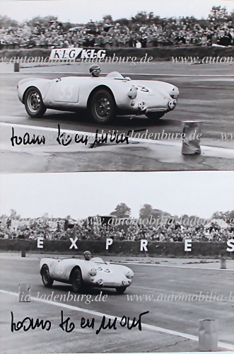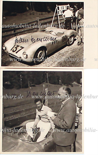 Solitude Rennen 1956, Konvolut zwei handsignierte original s/w Aufnahmen, Hans Herrmann belegte den ersten Platz auf Porsche 550 Spyder, 10x7cm