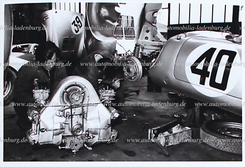 Le Mans 1954, original s/w Aufnahme, Vorbereitung der Porsche 550 Spyder in der Porsche Garage in Teloché, 8,5x13cm