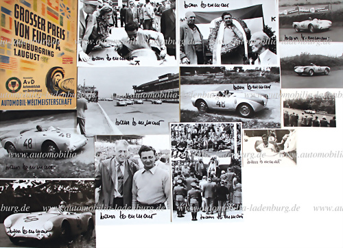 Grand Prix Deutschland 1954, Konvolut 14tlg., darunter 13 original s/w Aufnahmen (teilweise handsigniert) Hans Herrmann auf Porsche 550 Spyder, erster Platz, dazu original Rennprogramm