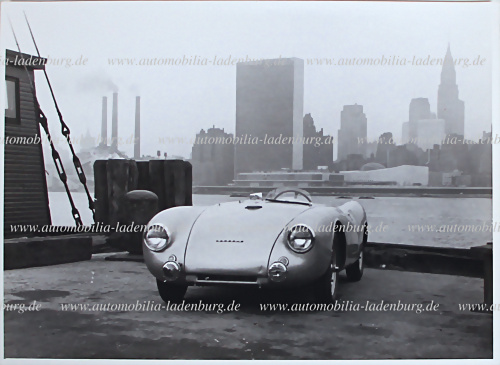 New York 1953, original s/w Aufnahme, der Porsche 550 Spyder auf dem Weg zum Rennen in Mexiko (Carrera Panamericana 1953), wunderschönes Foto, 13x18cm