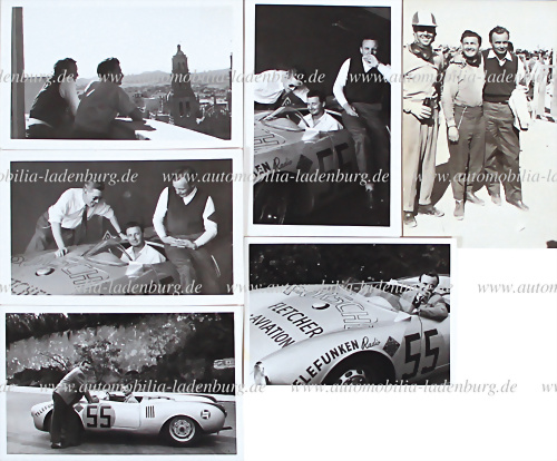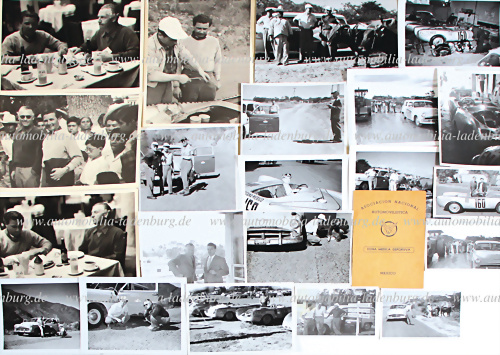 Carrera Panamericana Mexiko 1954, Konvolut 6 original s/w Aufnahmen, Hans Herrmann mit Jaroslav Juhan und Huschke von Hanstein und Fernando Segura, Hans Herrmann belegte auf dem Porsche 550 Spyder (#550-04) einen sensationellen dritten Platz im Gesamtklassement, 9x14cm