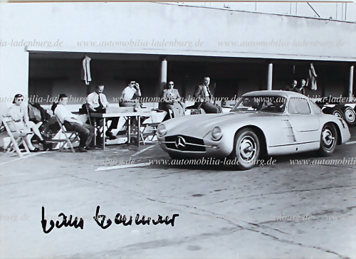 Handsignierte original s/w Aufnahme, Hans Herrmann bei Testfahrten in Monza, im Vordergrund der Mercedes Benz W194/11, 13x18cm