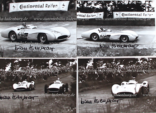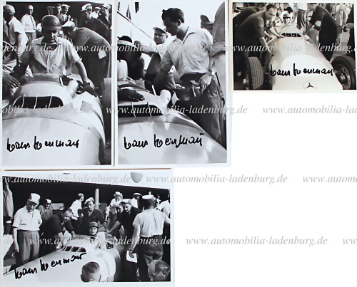 Grand Prix Monza 1954, Konvolut 4 handsignierte original s/w Aufnahmen, Hans Herrmann auf Mercedes Benz W196 Formel 1, versch. Formate, Sieger wurde Juan Manuel Fangio ebenfalls auf Mercedes Benz W196 vor Hawthorn und Gonzalez auf Ferrari, Herrmann belegte den 4. Platz
