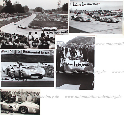 Grand Prix Berlin Avus 1954, Konvolut 5 handsignierte original s/w Aufnahmen, Training und Rennen, Mercedes Benz triumphierte überlegen und die Werksfahrer Kling, Fangio und Herrmann belegten die Plätze 1 bis 3, verschiedene Formate