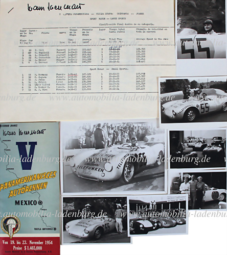 Carrera Panamericana Mexiko 1954, Konvolut 8tlg., darunter 6 original s/w Aufnahmen, darunter wunderschönes Foto der 4 Porsche 550 Spyder von Herrmann, Juhan, Segura und Chavez..., Evans mit Segura vor dem Porsche 356SL (#356/2-054), dazu Reglement in deutscher Ausführung, sowie 4 Seiten offizielle... mehr