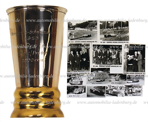 Freiburg Schauinsland 1963, Konvolut 14tlg., darunter Silberpokal (silber 925) „Bergpreis Schauinsland 1963 – 2. Preis Sport / Prototypen 2000ccm“, Höhe 14,5cm, dazu 13 handsignierte original s/w Aufnahmen, Hans Herrmann auf Abarth 2000 SP (2. Platz im Gesamtklassement), verschiedene Formate