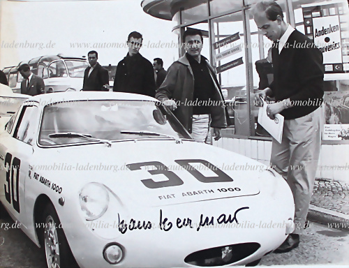 ADAC 500km Rennen Nürburgring 1963, Konvolut zwei handsignierte original s/w Aufnahmen, Herrmann mit Carlo Abarth und dem Abarth 2000SP, der Wagen ist aufgrund technischer Probleme nicht zum Einsatz gekommen, 13x13 und 13x18cm