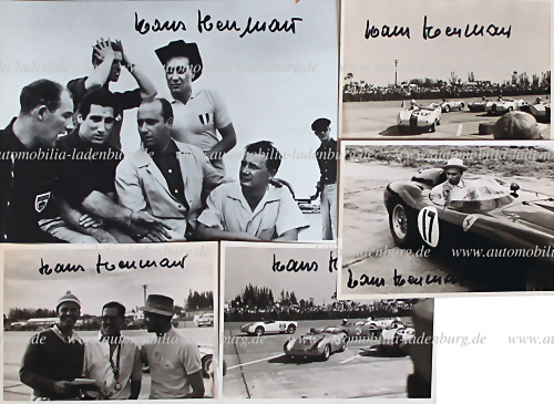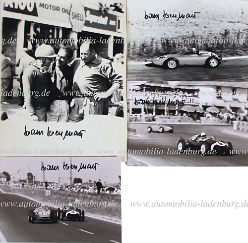 Coupe Internationale de Vitesse Reims 1959, Konvolut 4 handsignierte original s/w Aufnahmen, Hans Herrmann auf Behra Porsche F2, ein Foto zeigt Herrmann zusammen mit Behra der nur 4 Wochen später beim Avus Rennen in Berlin tödlich verunglückte, (Herrmann belegte in Reims den zweiten Platz),... mehr