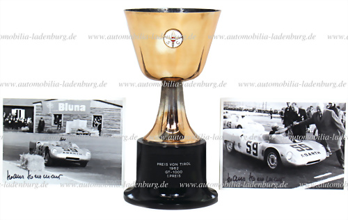 Großer Preis von Tirol Innsbruck 1962, Konvolut 3tlg., darunter Siegerpokal „Preis von Tirol 1962 – GT 1000 – 1. Preis“, Höhe 25,5cm, dazu zwei handsignierte original s/w Aufnahmen, Hans Herrmann auf Abarth 1000GT (1. Klasse, 4. Platz im Gesamtklassement)