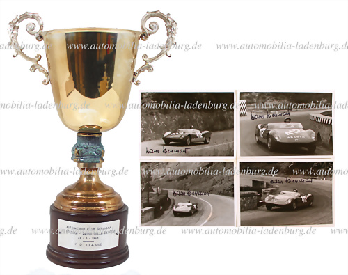 Raticosa Bergrennen 1963, Konvolut 5tlg., darunter Siegerpokal „Automobile Club Bologna VII Bologna – Passo della Raticosa 1. B Klasse“ 26.5.1963, Höhe 36,5cm, dazu 4 handsignierte original s/w Aufnahmen, Hans Herrmann auf Abarth 2000SP, Herrmann belegte den ersten Platz im Gesamtklassement, 13x18cm
