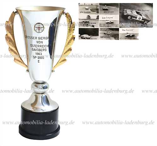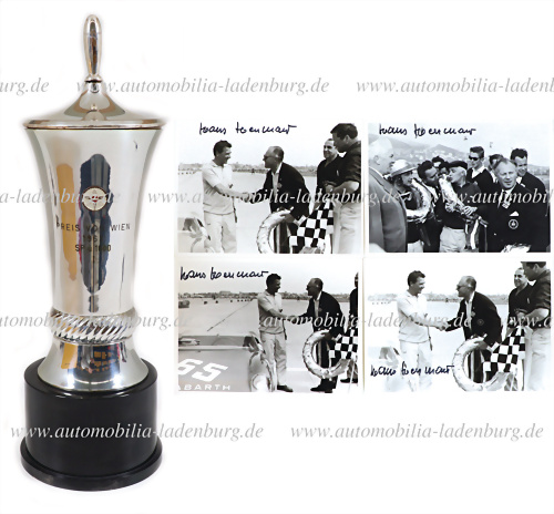 Aspern 1963, Konvolut 5tlg., darunter Siegerpokal „Preis von Wien 1963 – Sportwagen über 1600ccm 1. Preis“, Höhe 36,5cm, dazu 4 handsignierte original s/w Aufnahmen, Hans Herrmann auf Abarth 1000TC, 1000GT und 2000 SP (1. Platz), ein Foto zeigt Herrmann zusammen mit Charles Vögele, 13x18cm