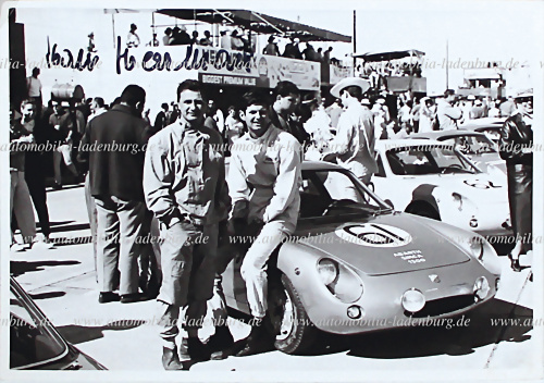 12 Stunden Sebring 1963, handsignierte original s/w Aufnahme, Hans Herrmann und Tommy Spychiger mit dem Abarth Simca 1300, die beiden Fahrer belegten den ersten Platz in der Klasse 1300, 13x18cm