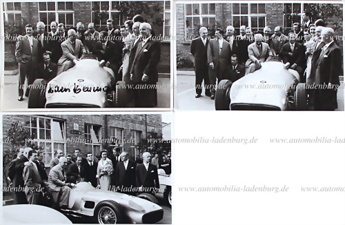 24. Oktober 1955, Konvolut 3 original s/w Aufnahmen (1x handsigniert), die Mercedes Benz Rennmannschaft mit Alfred Neubauer, Hans Herrmann, Graf Berghe von Trips, Peter Collins, Piero Taruffi, John Fitch, Werner Engel, Juan Manuel Fangio, Olivier Gendebien, Karl Kling, Piero Taruffi...bei der... mehr