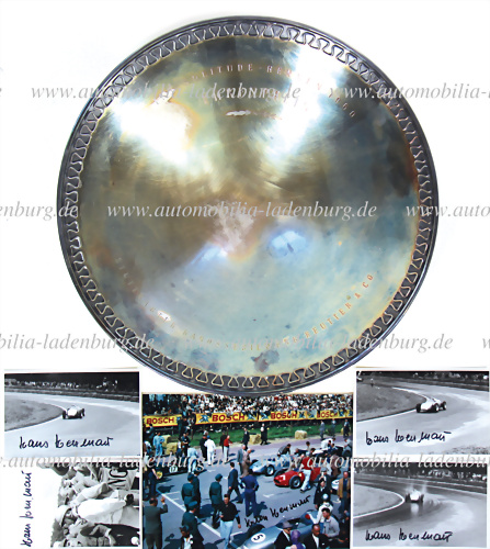 Großer Preis der Solitude 1960, Konvolut 5tlg., darunter Siegerpreis, Silberschale (925 silber) „Internationales Solitude Rennen 1960 – Ehrenpreis des Stuttgarter Karosseriewerk Reutter & Co“, Durchmesser 34,5cm, dazu 4 handsignierte original s/w Aufnahmen, Hans Herrmann auf Porsche 718 F2, Herrmann... mehr