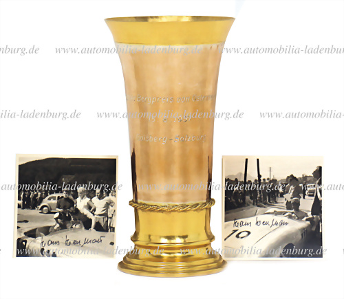 Gaisbergrennen 1957, Konvolut 3tlg., darunter Silberpokal (835 silber) „Großer Bergpreis von Österreich 1957 – Gaisberg – Salzburg Ehrenpreis ADAC“, Höhe 20,5cm, dazu zwei handsignierte original s/w Aufnahmen, Hans Herrmann (mit Helm von Edgar Barth) und Giulio Cabianca auf Borgward Hansa 1500 RS,... mehr