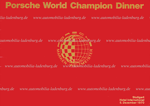 Hotel International Stuttgart, 5. Dezember 1970, „Porsche World Champion Dinner“, innen handsigniert von Jo Siffert, Brian Redman, Pedro Rodriguez, Vic Elford, Kurt Ahrens, Hans Herrmann, Richard Attwood, Björn Waldegaard, Andersson, Larrousse, van Lennep und Jürgen Neuhaus, guter Zustand