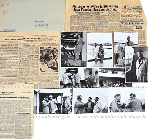 Grand Prix England 1954, Konvolut 9 original s/w Aufnahmen der Überfahrt mit dem Mercedes Benz Team, dazu Zeitungsberichte, 15x10cm