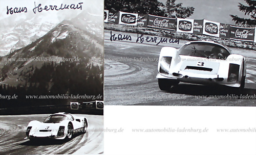 Lenzerheide 1957, zwei handsignierte original s/w Aufnahmen, Hans Herrmann mit dem Borgward Hansa 1500 RS (erster Platz in der Klasse und 4. Platz Gesamtklassement), 9x9cm und 7x10cm