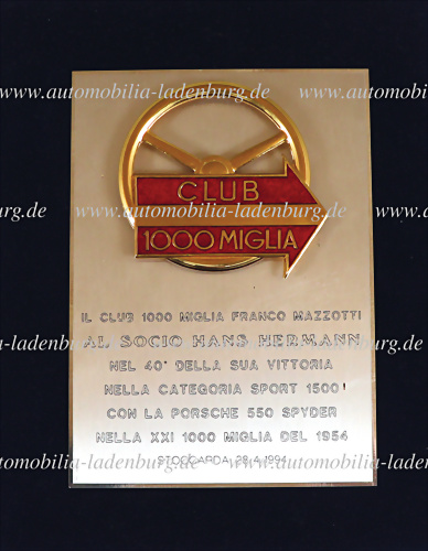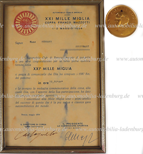 Mille Miglia 1954, Urkunde mit Ergebniszeit „in ore 12,35´44“, handsigniert von Renzo Castagneto und Aymo Maggi, gerahmt 23x16cm, dazu goldene Plakette Tazio Nuvolari „XXI Mille Miglia“, 5cm Durchmesser, Hans Herrmann und Herbert Linge auf Porsche 550 Spyder (#550-08), Herrmann / Linge belegten den... mehr