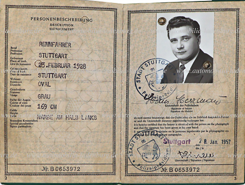 19.1.1955, offizielles Reisedokument für Uruguay, handsigniert von Hans Herrmann, das Reisedokument war für die Reise zum Rennen in Argentinien ausgestellt worden, Hans Herrrmann auf Mercedes Benz W196