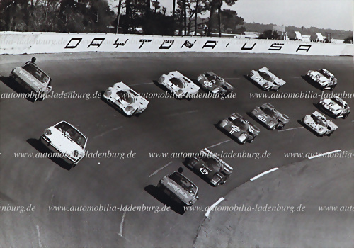 1971, original s/w Aufnahme, Hans Herrmann im Porsche 911 targa „pace car“, 24 Stunden Daytona, wunderschönes Foto, unter anderem ist der Porsche 917K Siegerwagen von Oliver / Rodriguez und der zweitplatzierte Ferrari 512S von Bucknum / Adamowicz zu sehen...18x24cm