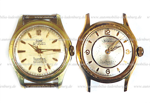 Konvolut zwei defekte Armbanduhren, Hans Herrmann hat diese nach seinen beiden schweren Unfällen beim Grand Prix Monaco 1955 (Mercedes Benz W196) und beim Grand Prix Deutschland auf der Avus 1959 (BRM F1) als Erinnerungsstücke aufbewahrt...Hersteller ZoMe Automatic Nivalflex (Unfall Monaco) und... mehr