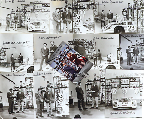Konvolut 24 original s/w und Farbaufnahmen, Hans Herrmann beim ZDF Sportstudio „Sieg in Le Mans 1970“, überwiegend handsigniert von Herrmann, verschiedene Formate
