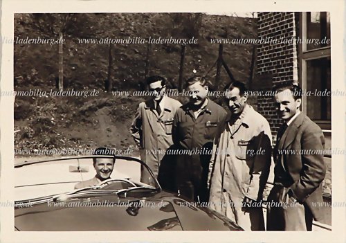 Zuffenhausen April 1956, original s/w Aufnahme, Hans Herrmann, Herr Lörcher, Herr Trostmann, Paul Denk und Dr. Fuhrmann, 7x10cm