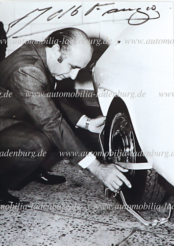 Handsignierte original s/w Aufnahme von Juan Manuel Fangio, Fangio machte hier Werbung für Hans Herrmanns „Snowgrip“, 18x13cm