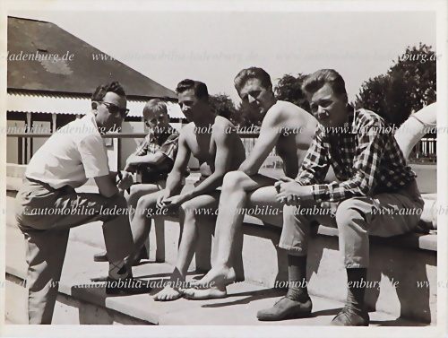 Le Mans Juli 1956, original s/w Aufnahme, Ferry Porsche, Hans Herrmann und Graf Berghe von Trips im Freibad, 9x12cm