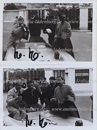 Mille Miglia 1954, zwei original s/w Aufnahmen, Heinrich Sauter, Hans Herrmann, Herbert Linge und Richard von Frankenberg, mit dem Porsche 550 Spyder (#550-08), 6,5x9cm