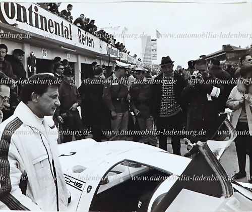 1000km Nürburgring 1968, original s/w Aufnahme, Hans Herrmann neben dem Porsche 907, er wird von seinem Freund „Blacky“ Fuchsberger auf den Film gebannt....24x30cm