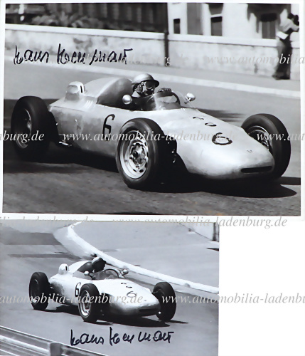 Grand Prix Monaco 1961, zwei original handsignierte s/w Aufnahmen, Hans Herrmann auf Porsche 718 F1, 13x18cm und 18x24cm