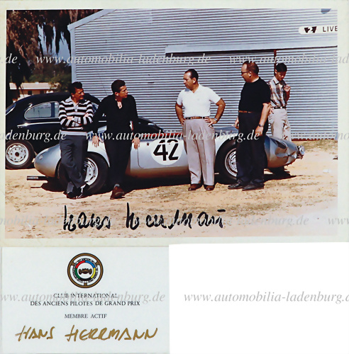Konvolut 2tlg., darunter 12 Stunden Sebring 1960, handsignierte original Farbaufnahme, Hans Herrmann und Olivier Gendebien mit dem Porsche RS 60, (erster Platz im Gesamtklassement), 13x18cm, dazu Mitgliedsausweis „Club International des Anciens Pilotes de Grand Prix“