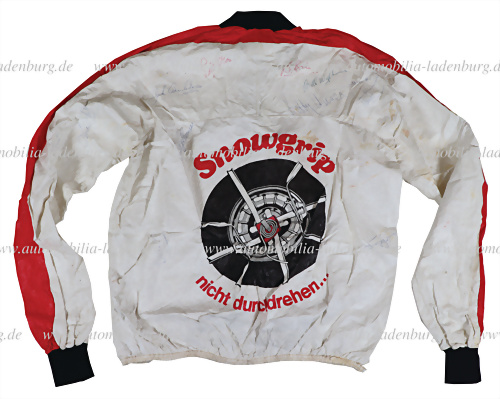 Von zahlreichen Fahrern handsignierte Werbejacke (Windjacke) „Snowgrip“, handsigniert von Denis Hulme, Mike Hailwood, Jack Brabham, Stirling Moss, Dieter Glemser, Jackie Ickx, Bette Hill, Pedro Rodriguez, Toulo de Graffenried, Roy Salvadori, Innes Ireland, Prinz Bira...Größe L, dazu zwei s/w... mehr
