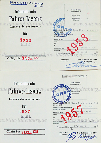 Konvolut zwei Internationale Fahrer Lizenzen ONS Hans Herrmann (ohne Passbilder), guter Zustand