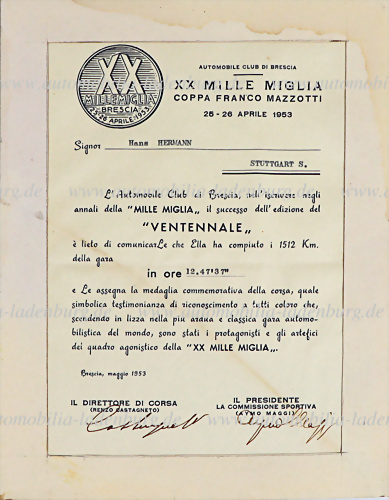 Mille Miglia 1953, Urkunde „XX MILLE MIGLIA“, mit der Ergebniszeit von Hans Herrmann und Erwin Bauer auf Porsche 356 1500 super „split window“, die beiden Piloten erreichten in einer Zeit von 12.47´37 das Ziel, handsigniert von Renzo Castagneto und Aymo Maggi 22x15cm